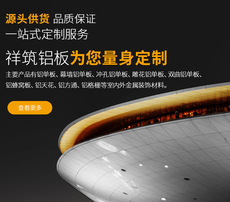 公司是一家集鋁單板研發、設計、銷售、安裝和技術服務于一體的現代化企業,以生產新型環保裝飾材料,美化生態環境為己任,專注鋁單板事業,核心產品有:鋁單板、 幕墻鋁單板、 沖孔鋁單板、 雕花鋁單板、 雙曲鋁單板、 鋁蜂窩板、 鋁天花、 鋁方 通、 鋁格柵等室內外金屬裝飾材料。?各系列產品適用于:地鐵、機場、商場體育館、 高鐵站、汽車站、博物館、醫院、銀行、寫字樓、學校、電影院、等公共場所的裝飾工程。公司自成立以來,經過壹拾玖年發展,目前已成為國內裝飾材料界設計能力強配套能力完善,產品系列齊全...